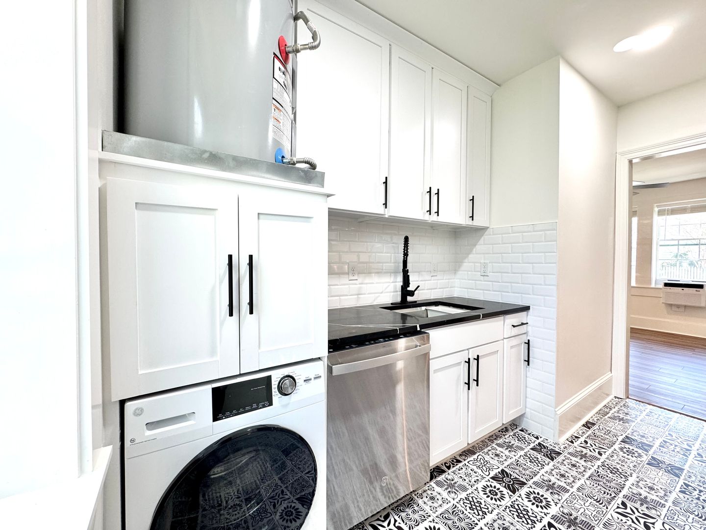 Each unit is thoughtfully designed with wood-style flooring, sleek Nero Marquina granite counters, stainless-steel appliances, and a private in-unit washer and dryer. Tall 10-foot ceilings and expansive bay windows flood the space with light, while generous cabinetry and oversized closets make organization effortless.